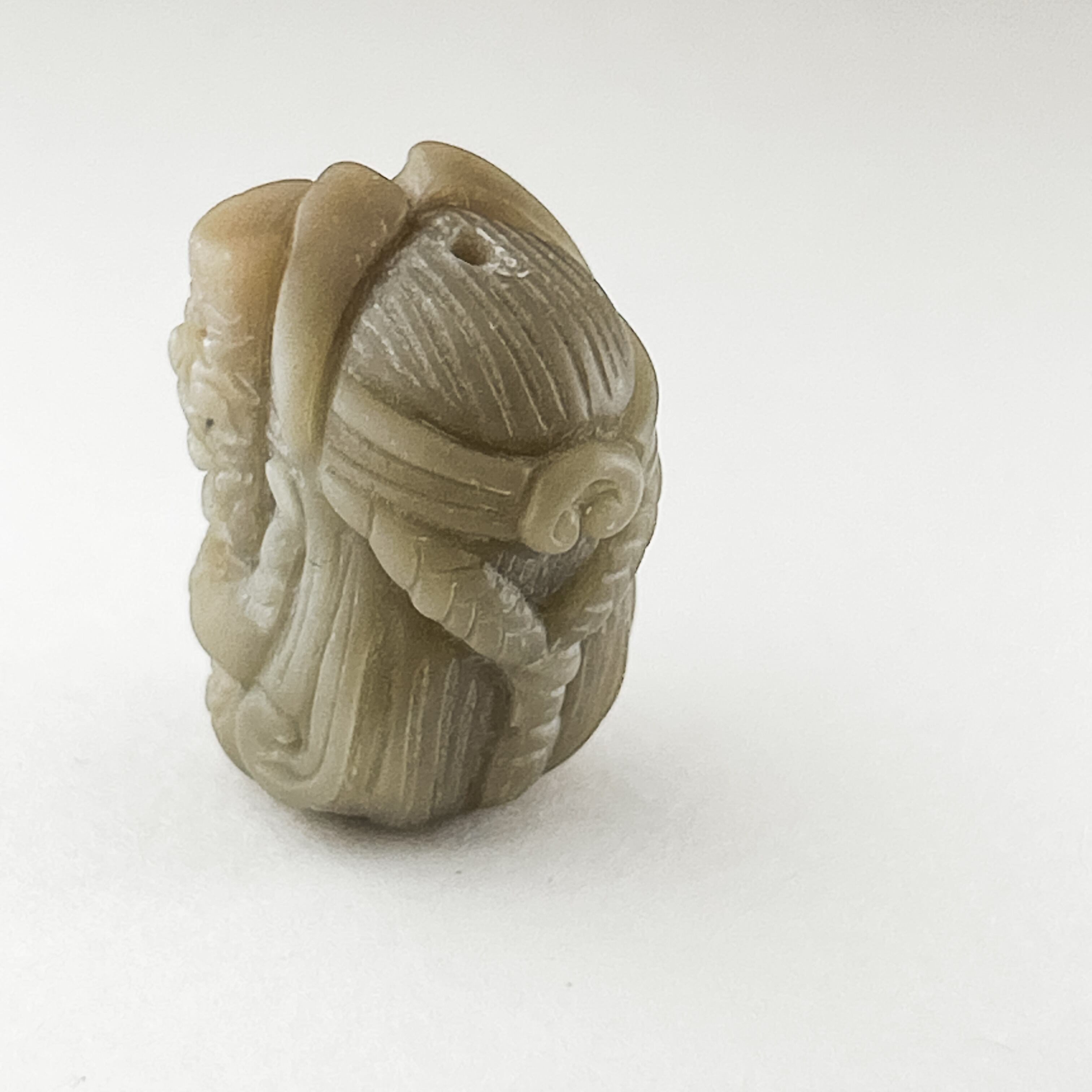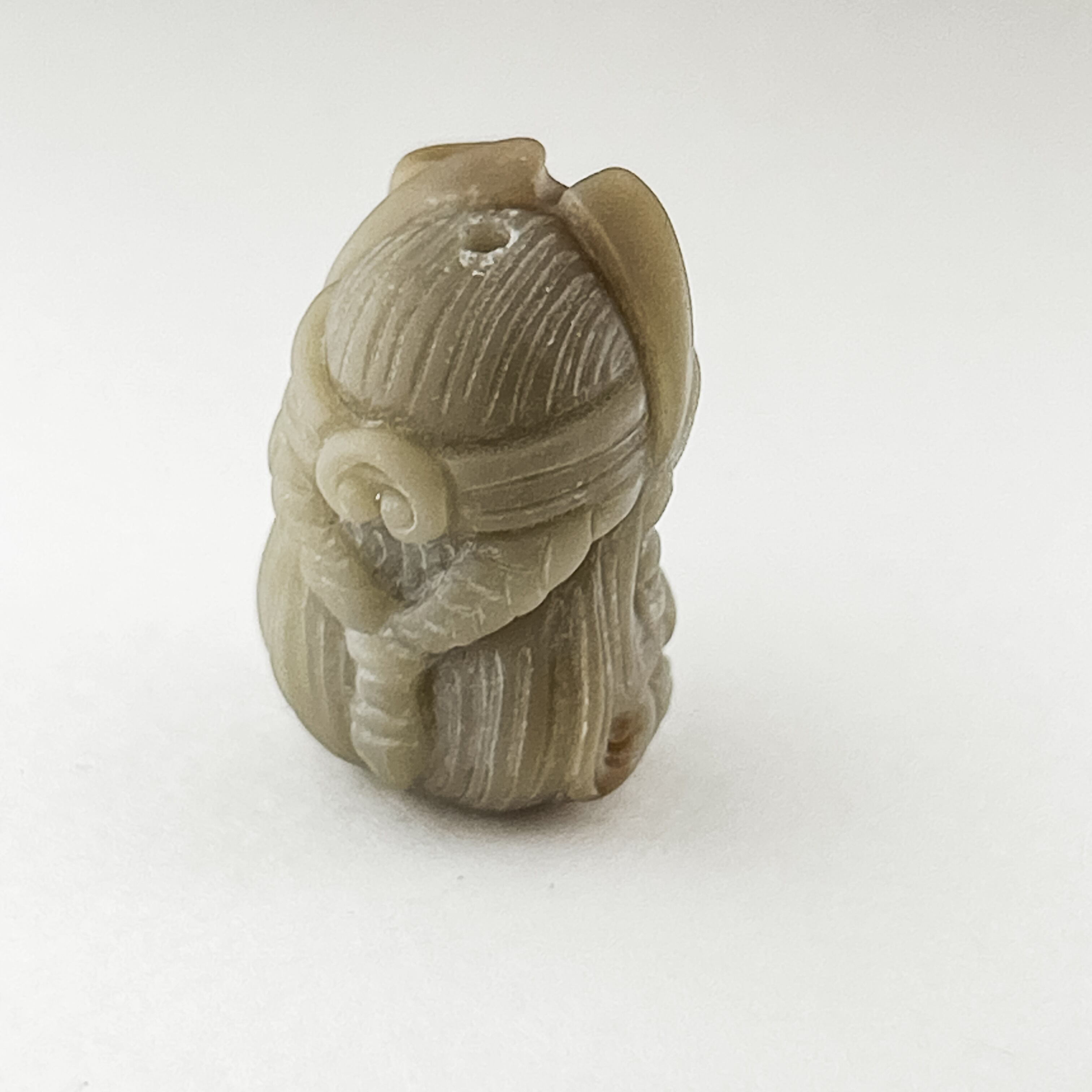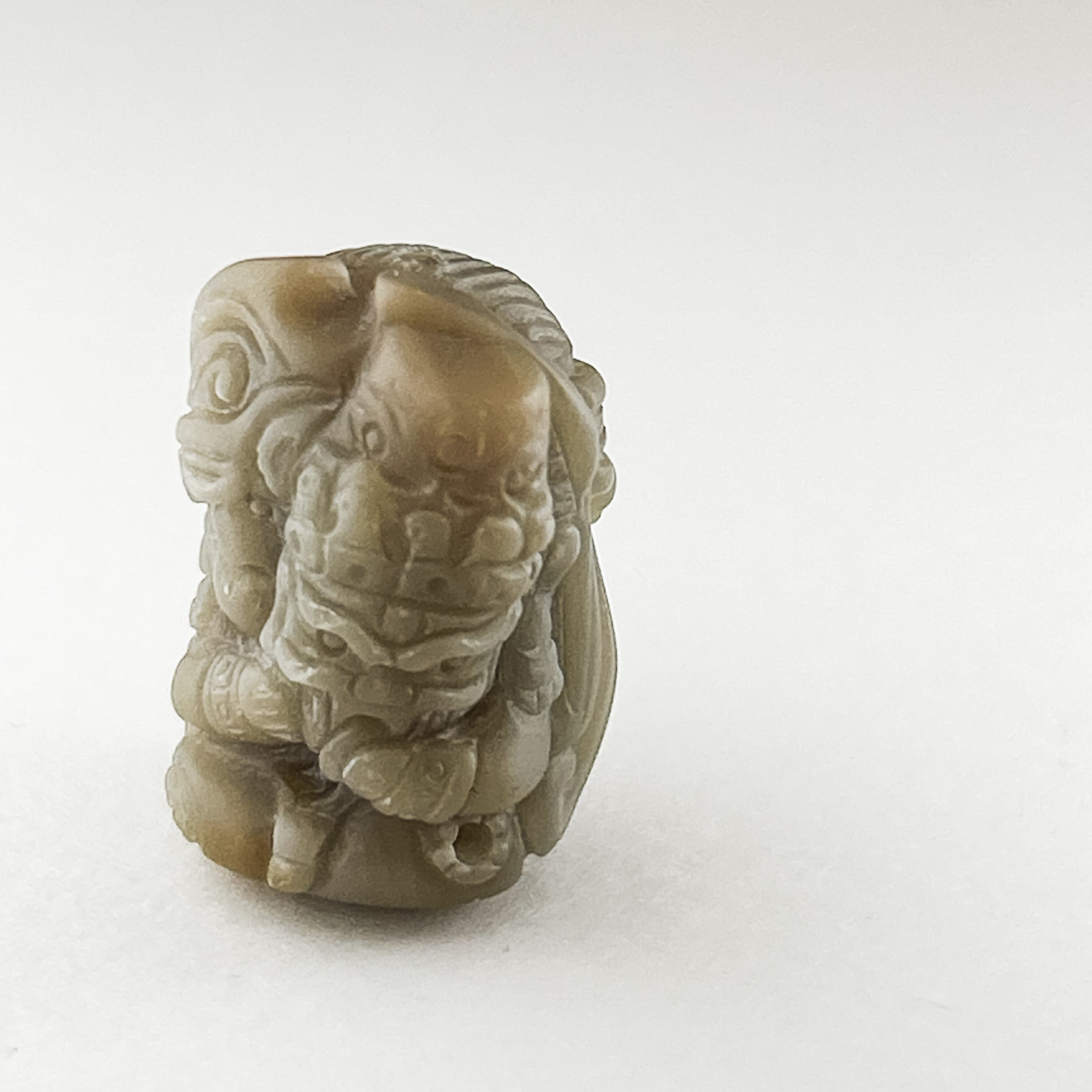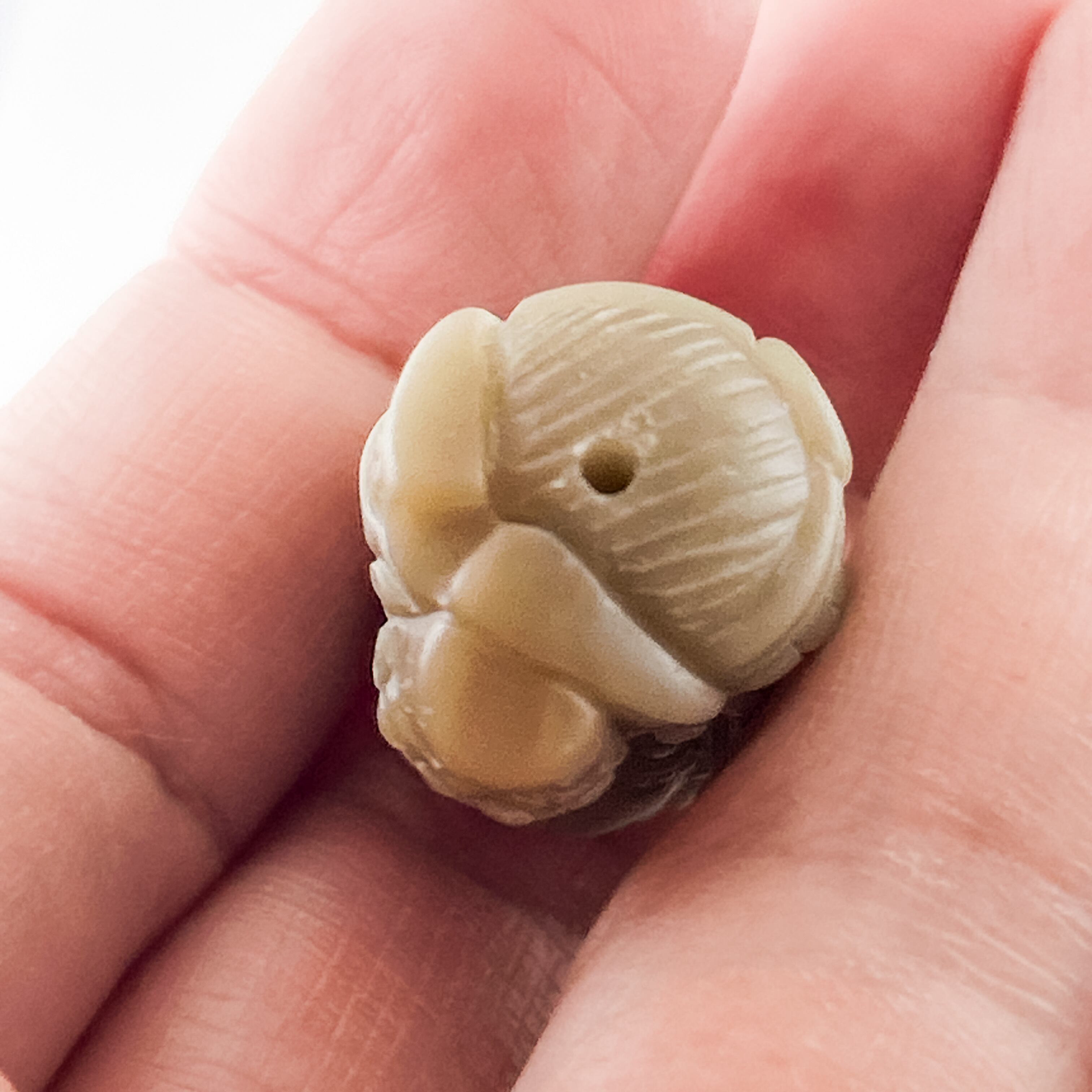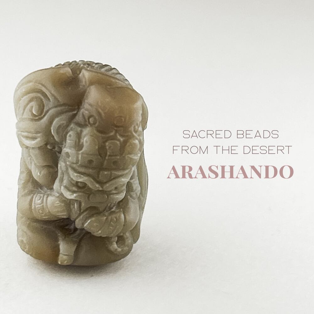 このビーズは、繊細な彫刻でザキラムの特徴的な仮面と優しい表情が表現されています。アラシャン瑪瑙のやさしい色合いが、見る人に落ち着きをもたらし、お守りとして日々の生活を支えてくれます。