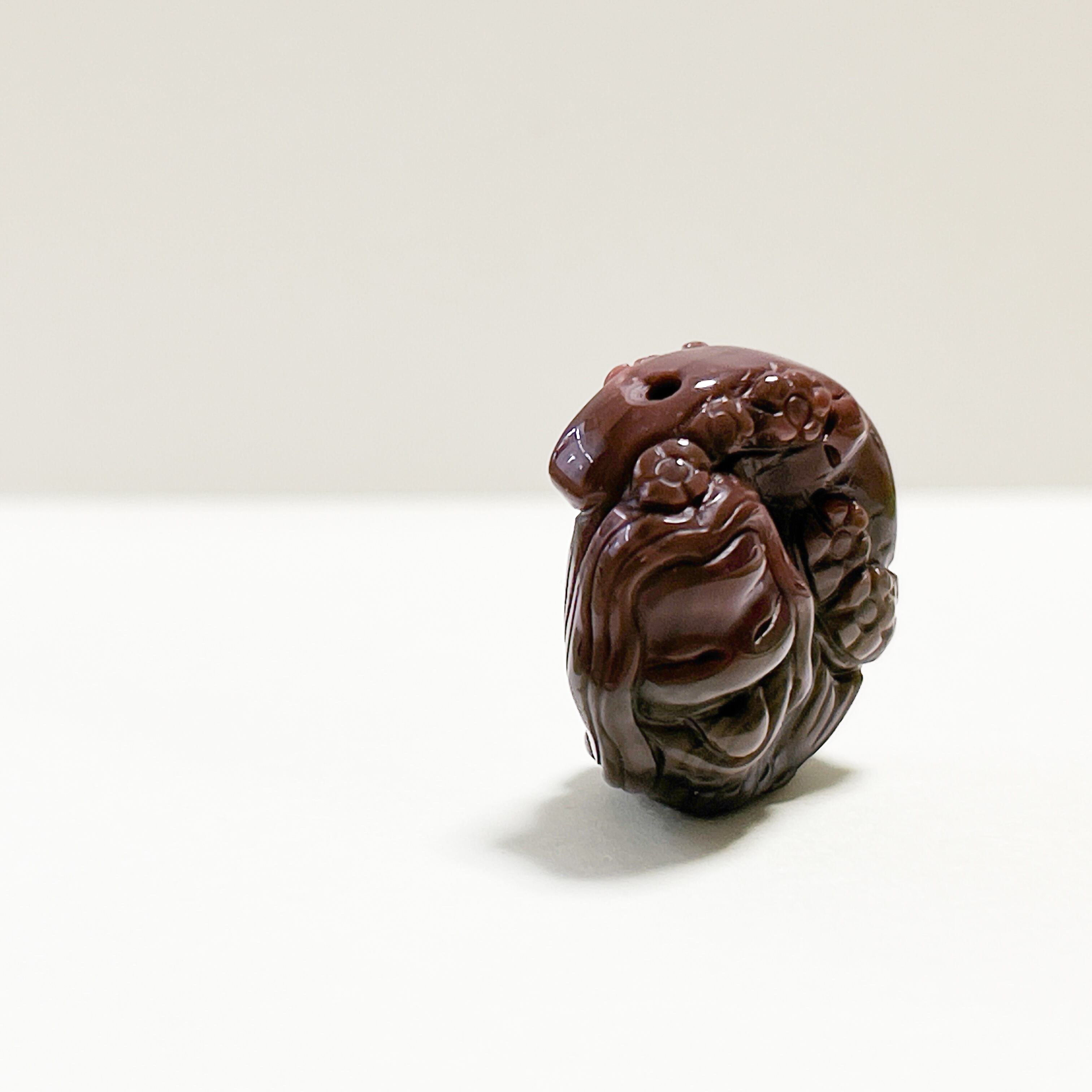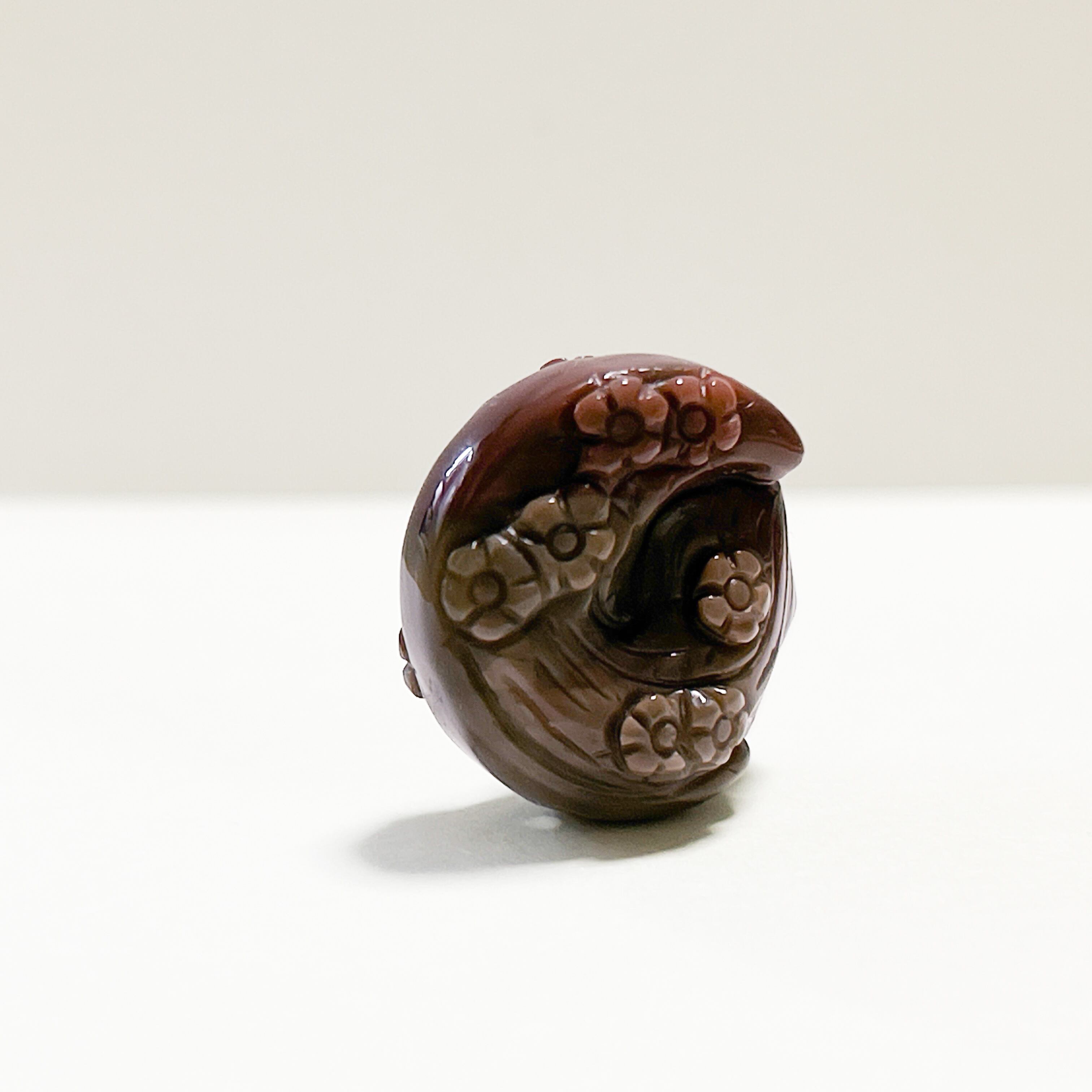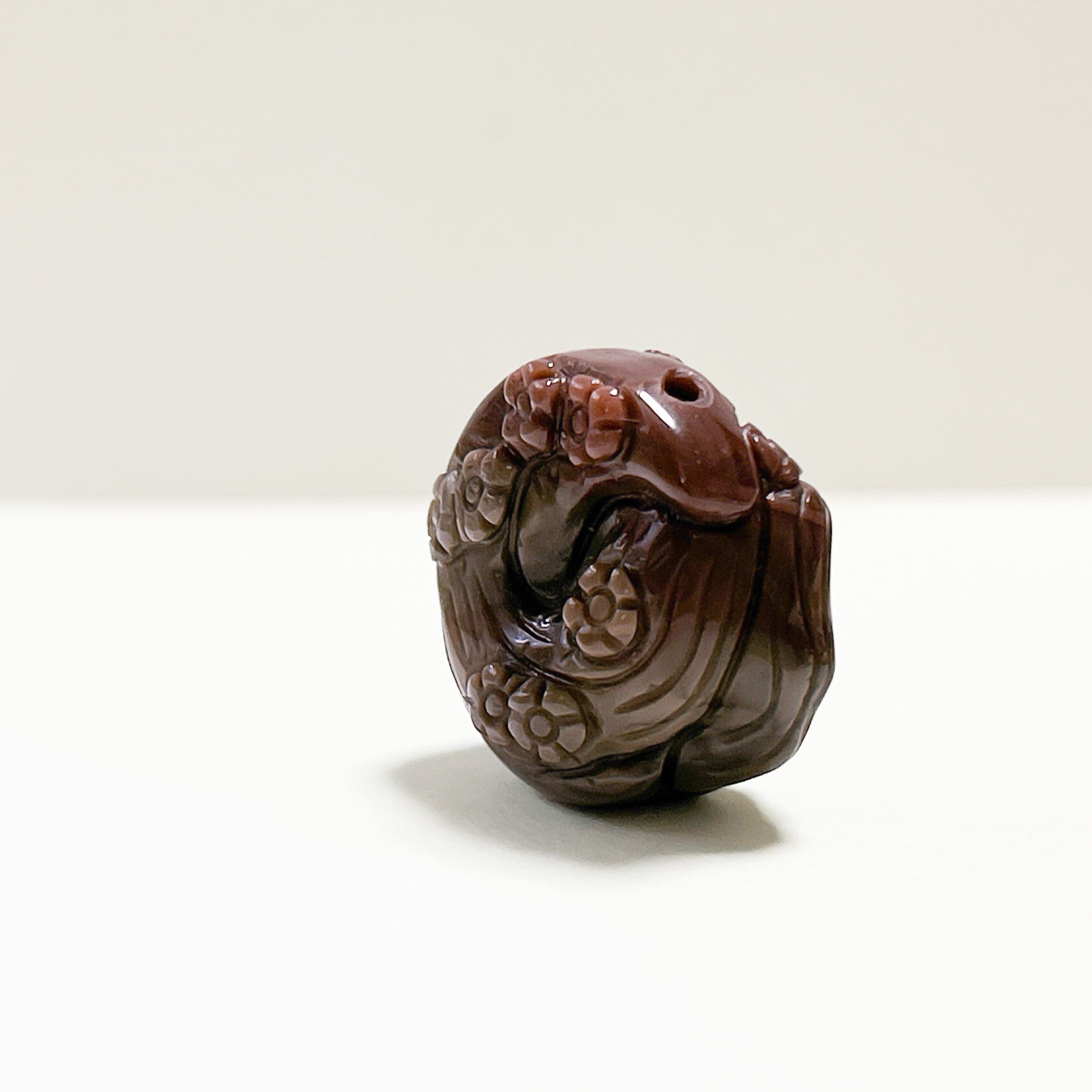 豊かなブラウンのグラデーションが美しい天然石アラシャン瑪瑙に、花々とともに愛らしい姿が彫り込まれています。