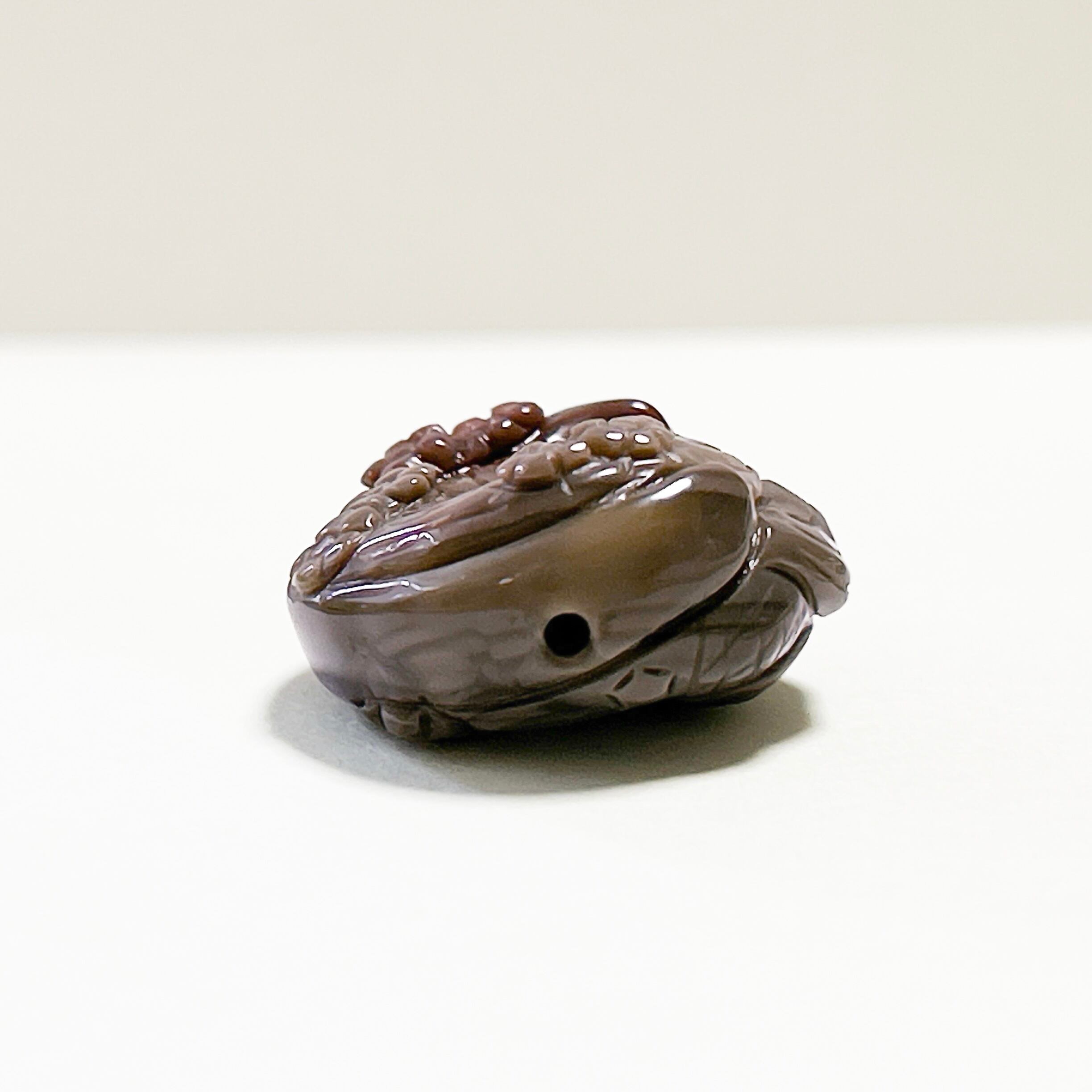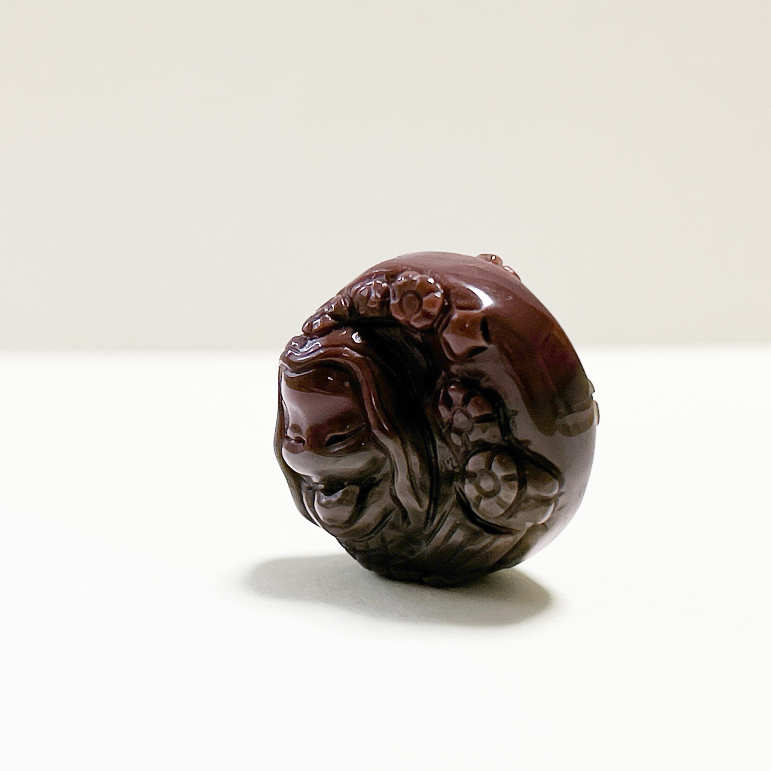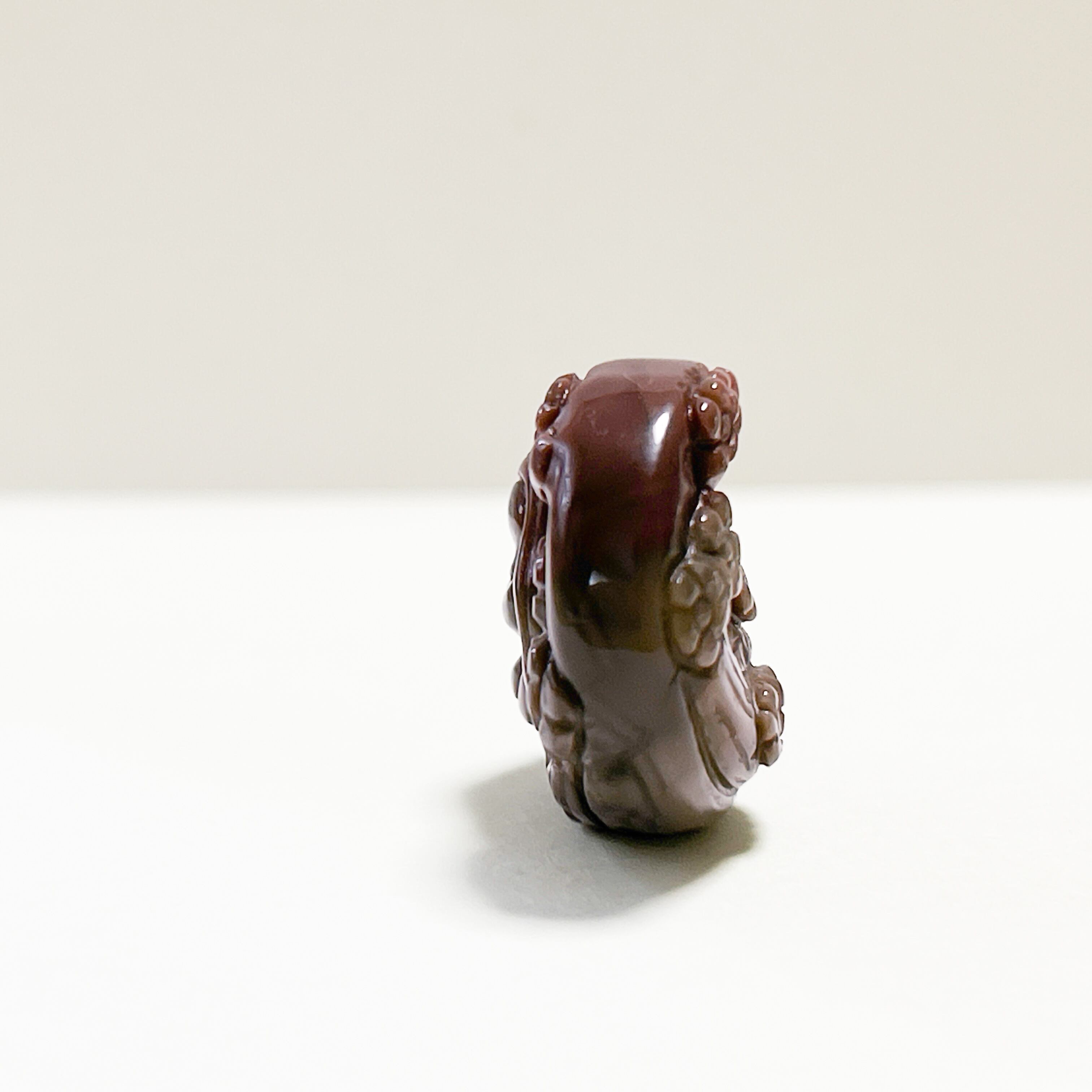 豊かなブラウンのグラデーションが美しい天然石アラシャン瑪瑙に、花々とともに愛らしい姿が彫り込まれています。