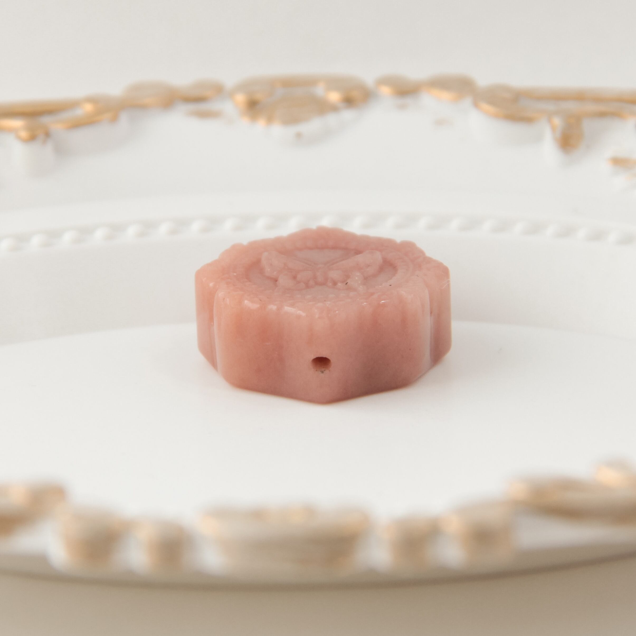 ふんわりとした桃色の中に、蝶が優しく浮かび上がる彫刻ビーズ。