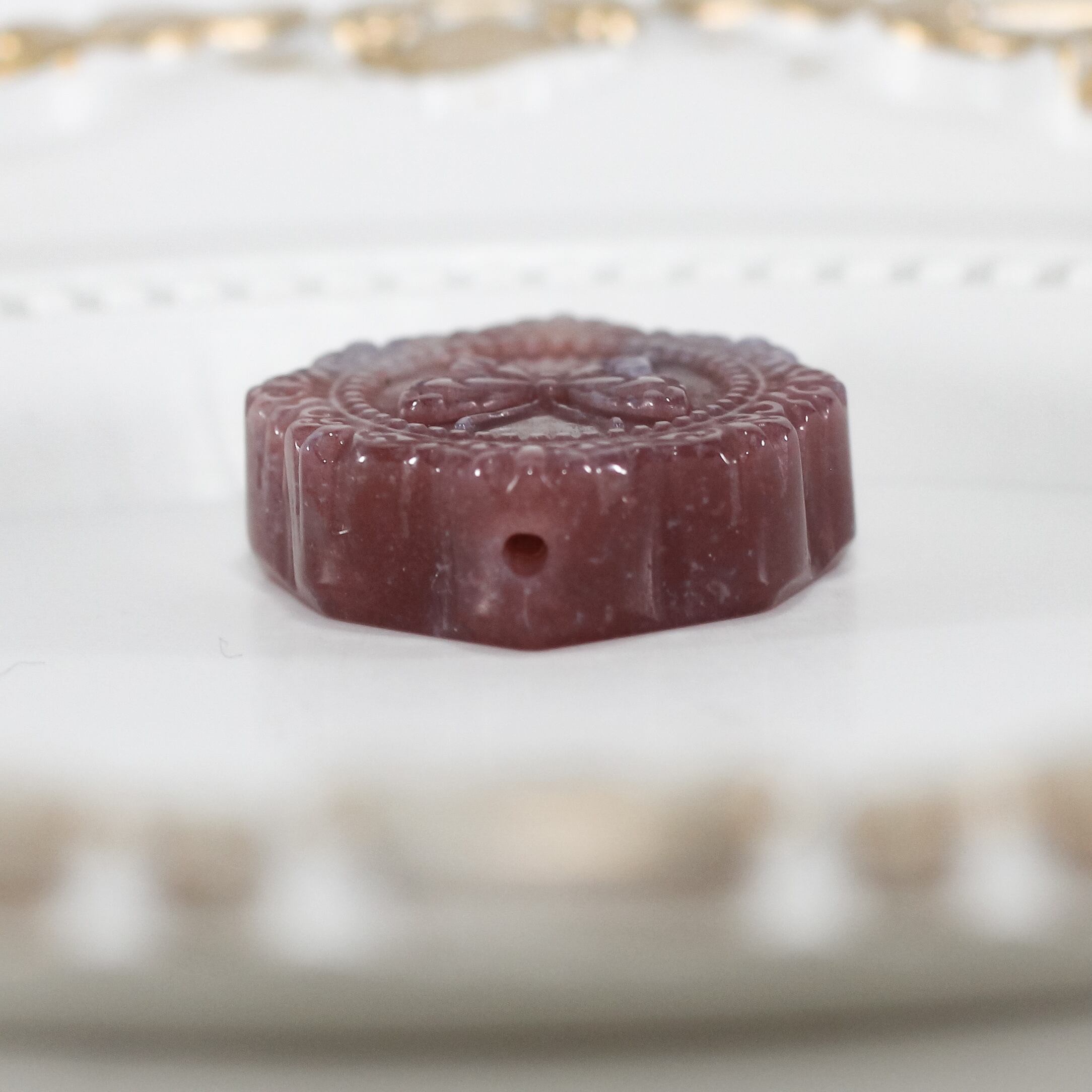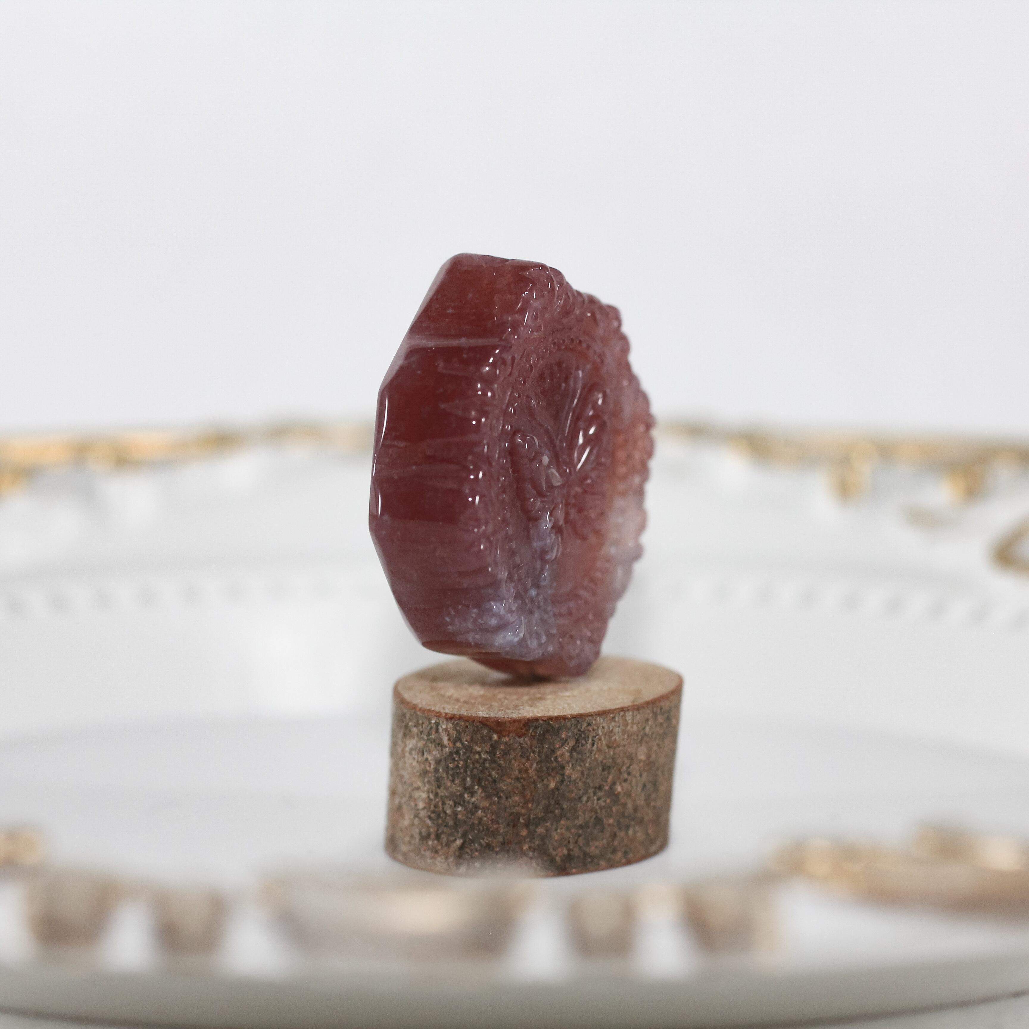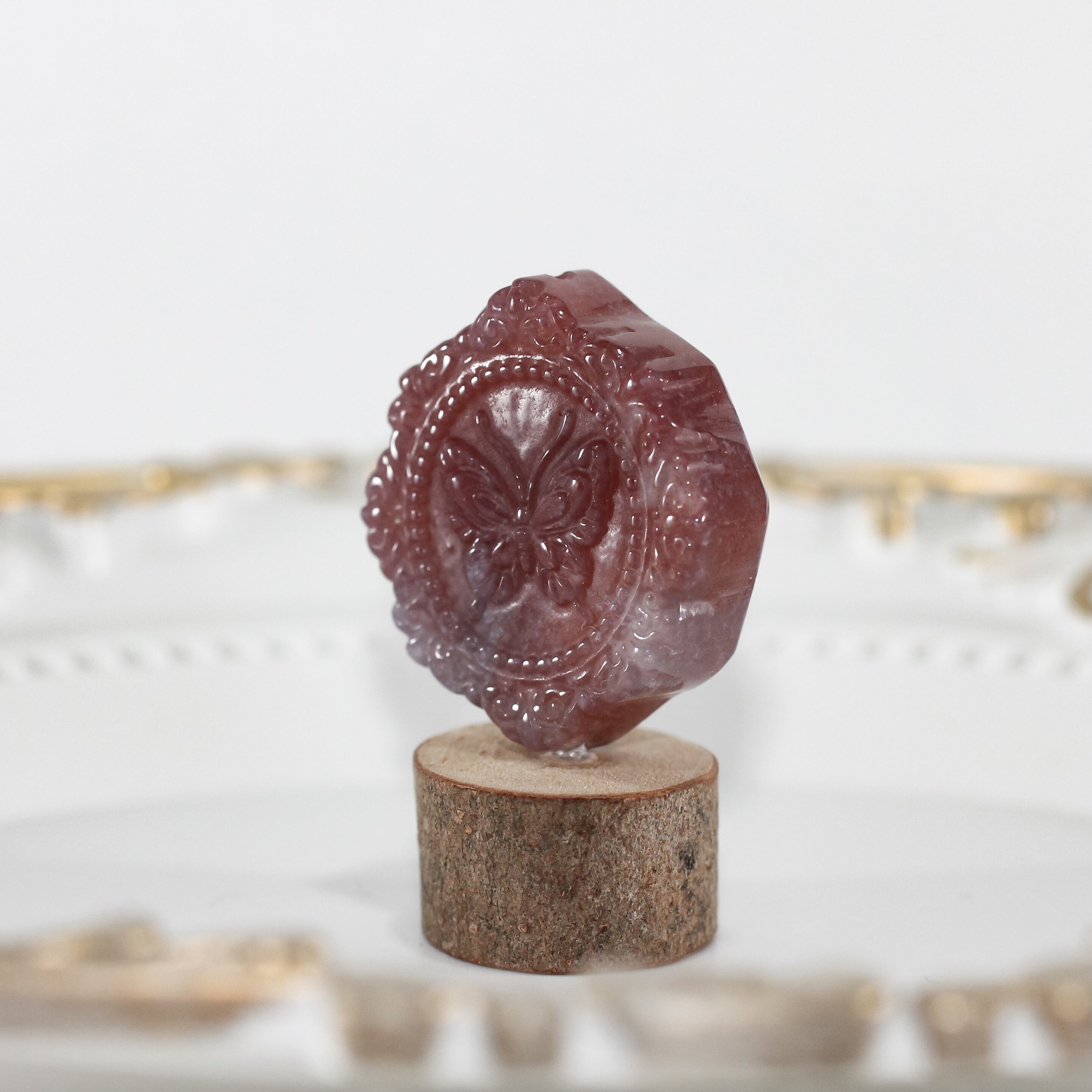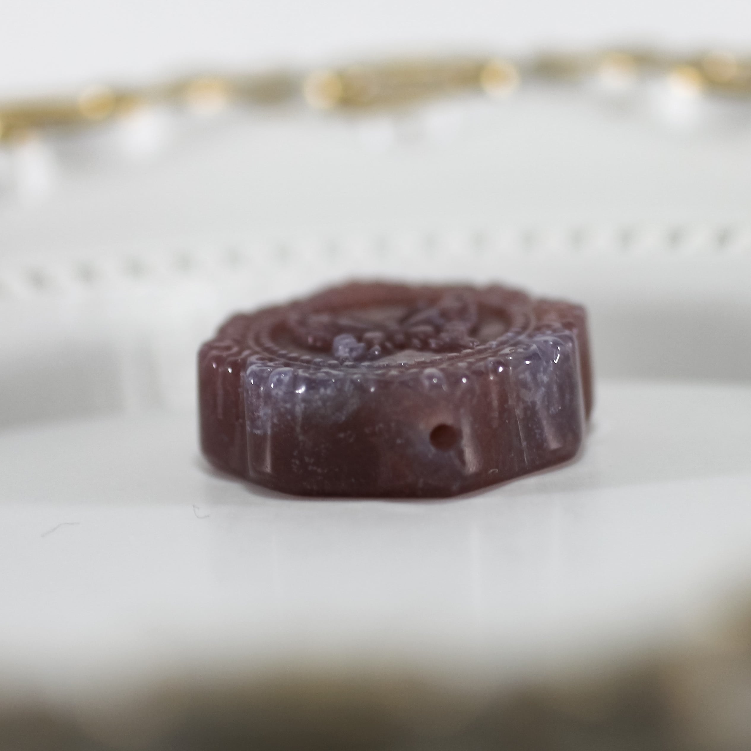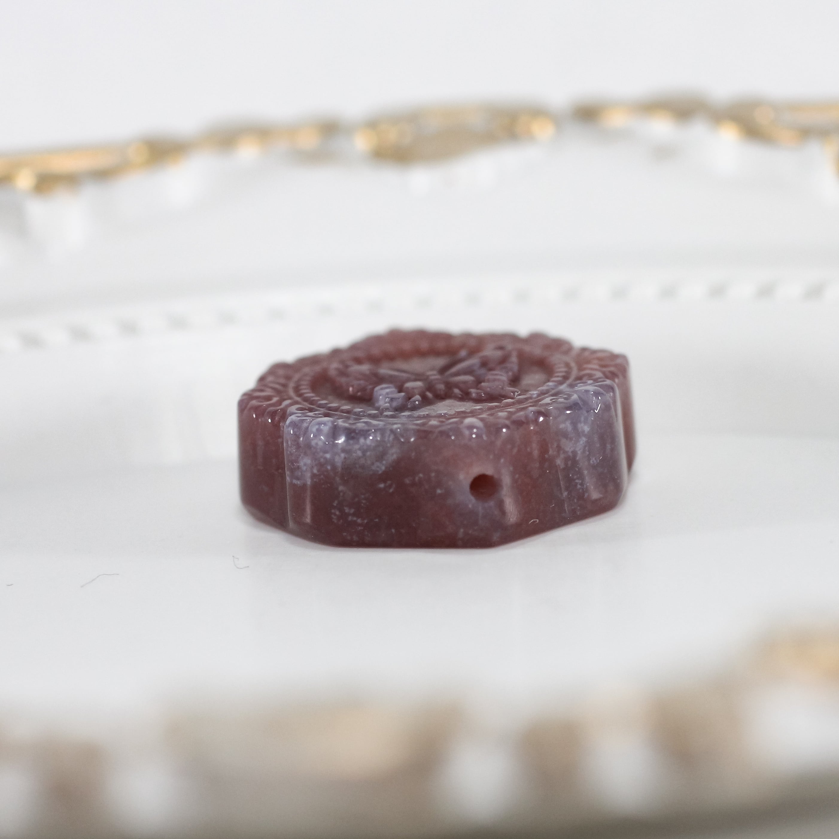 砂漠の奥深くで静かに咲いた一輪の夢。それは、ほんのりと赤紫を帯びたアラシャン瑪瑙に、繊細な蝶が浮かび上がる彫刻ビーズ。