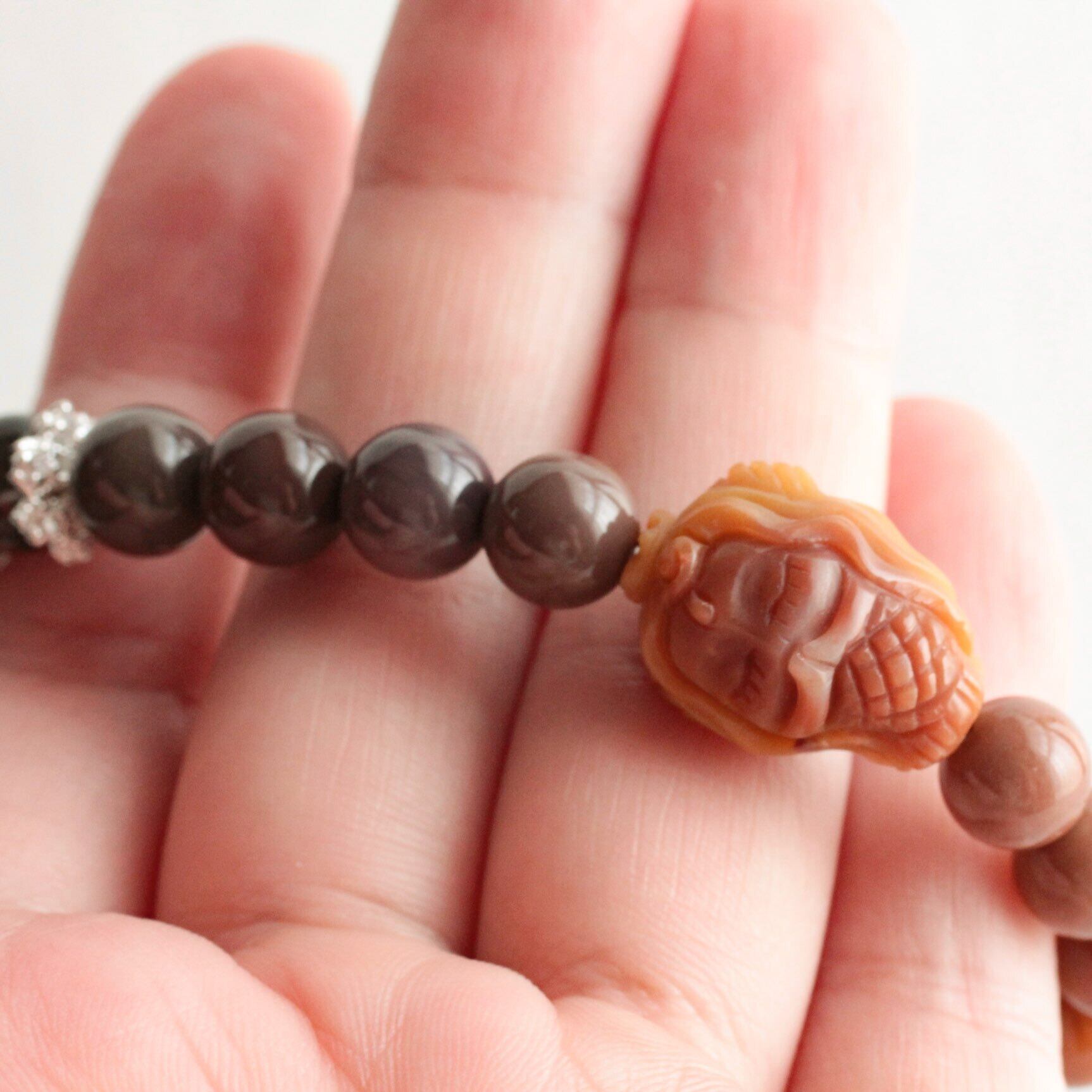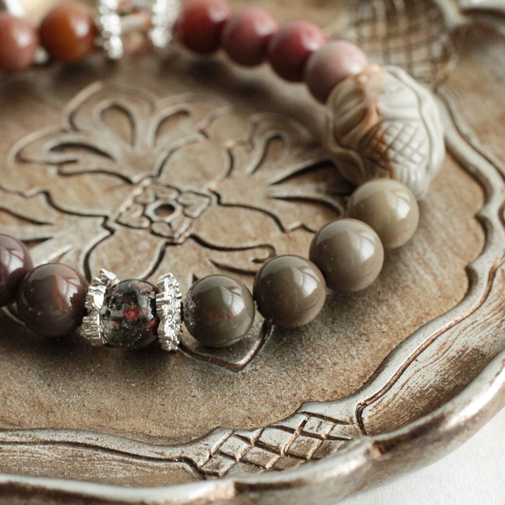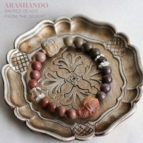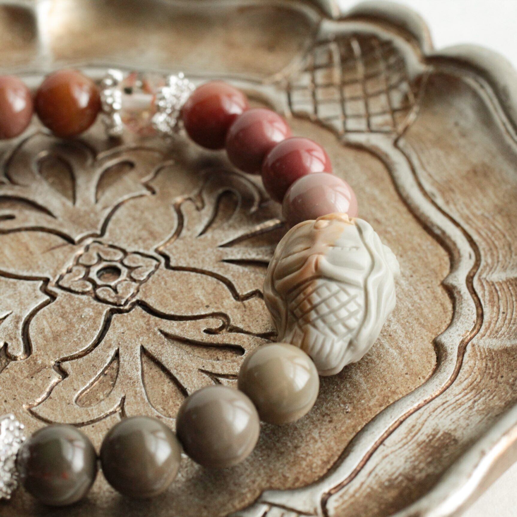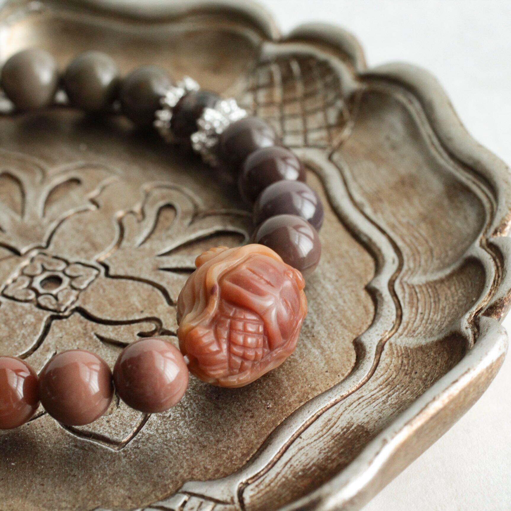 アラシャン瑪瑙 人魚彫刻ブレスレット– 夕暮れ色に包まれた海の記憶 アラシャン瑪瑙 彫刻ビーズ 人魚モチーフ くすみカラー 天然石 ブレスレット