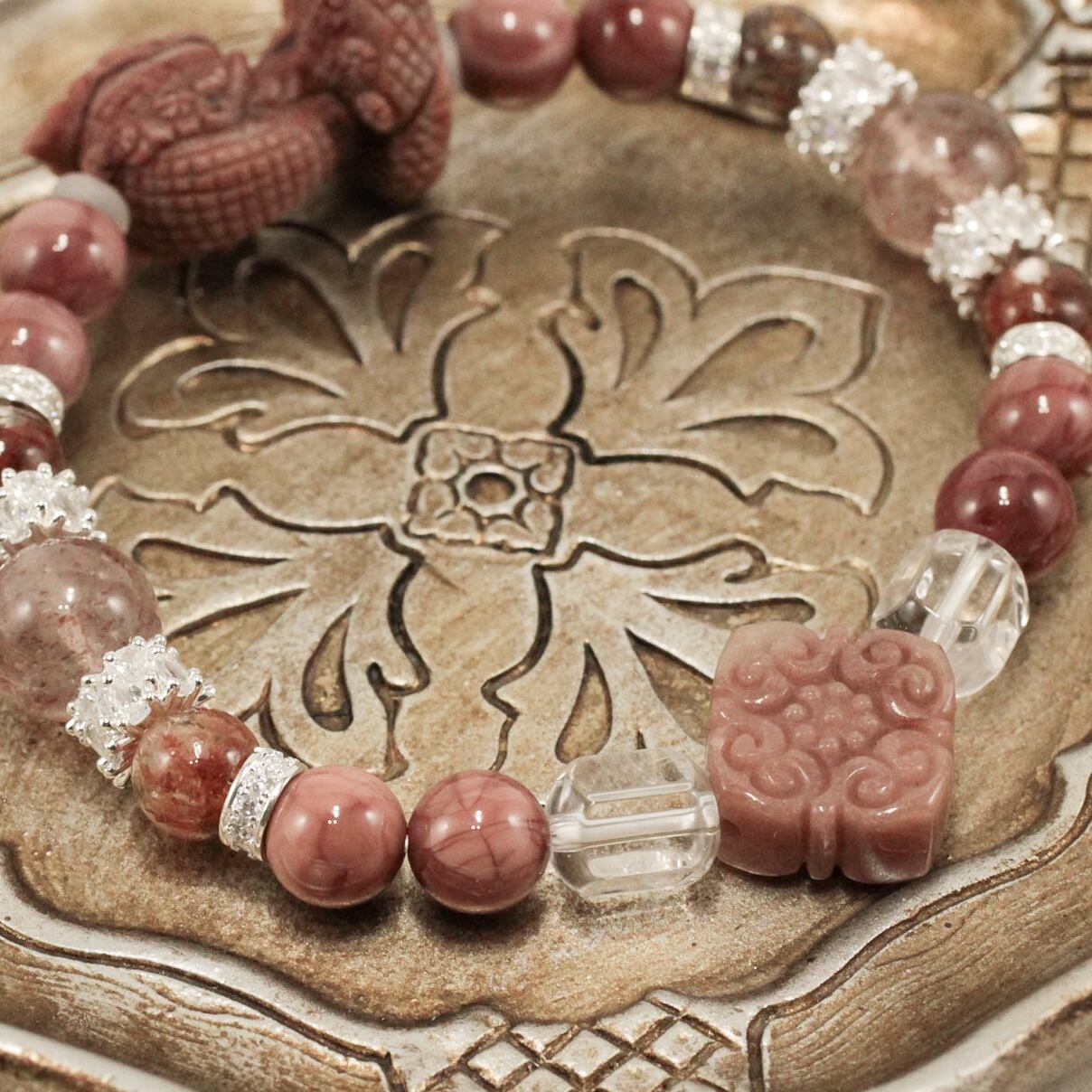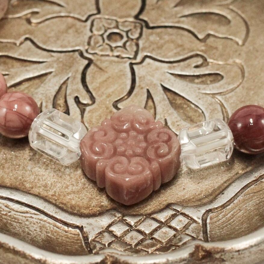 さらに、細やかな彫刻が施されたアラシャン彫りビーズ2種──「ティアラを戴いたコブラ」と「瑞雲文様」──が、品格と個性を引き立てます。アクセントには、クリアな輝きを放つクリスタルカットビーズを配置し、全体のバランスを整えました。