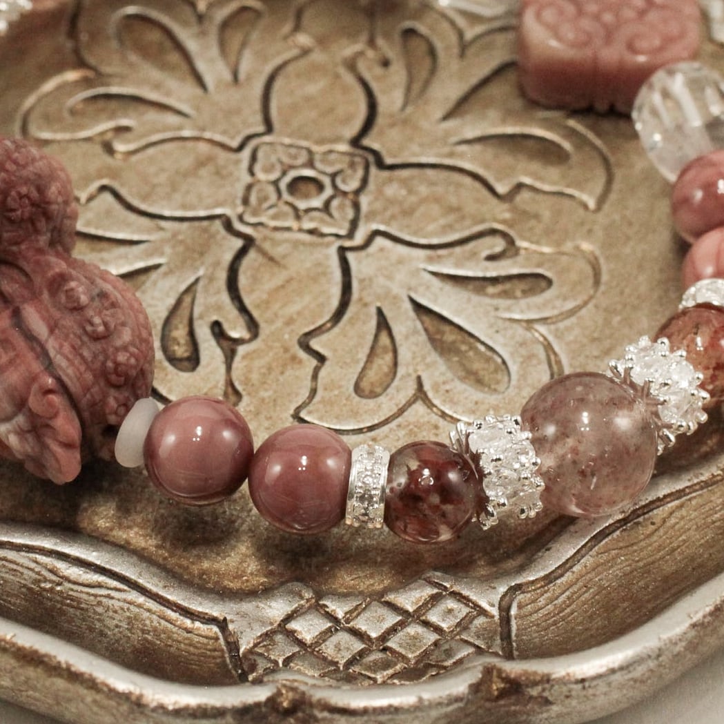 ピンク〜レッド系のマーブル模様が美しいアラシャン瑪瑙ビーズを中心に、透明感と奥行きを兼ね備えたガーデンクォーツ、淡く優しい輝きのアイスストロベリークォーツを組み合わせました。