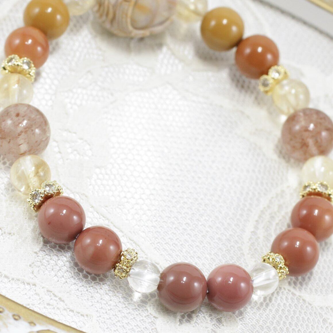 そこにマダガスカル産アイスストロベリークォーツの柔らかなピンクと、ブラジル産シトリンの黄金の光、そして透明なクリスタルを重ね合わせています。